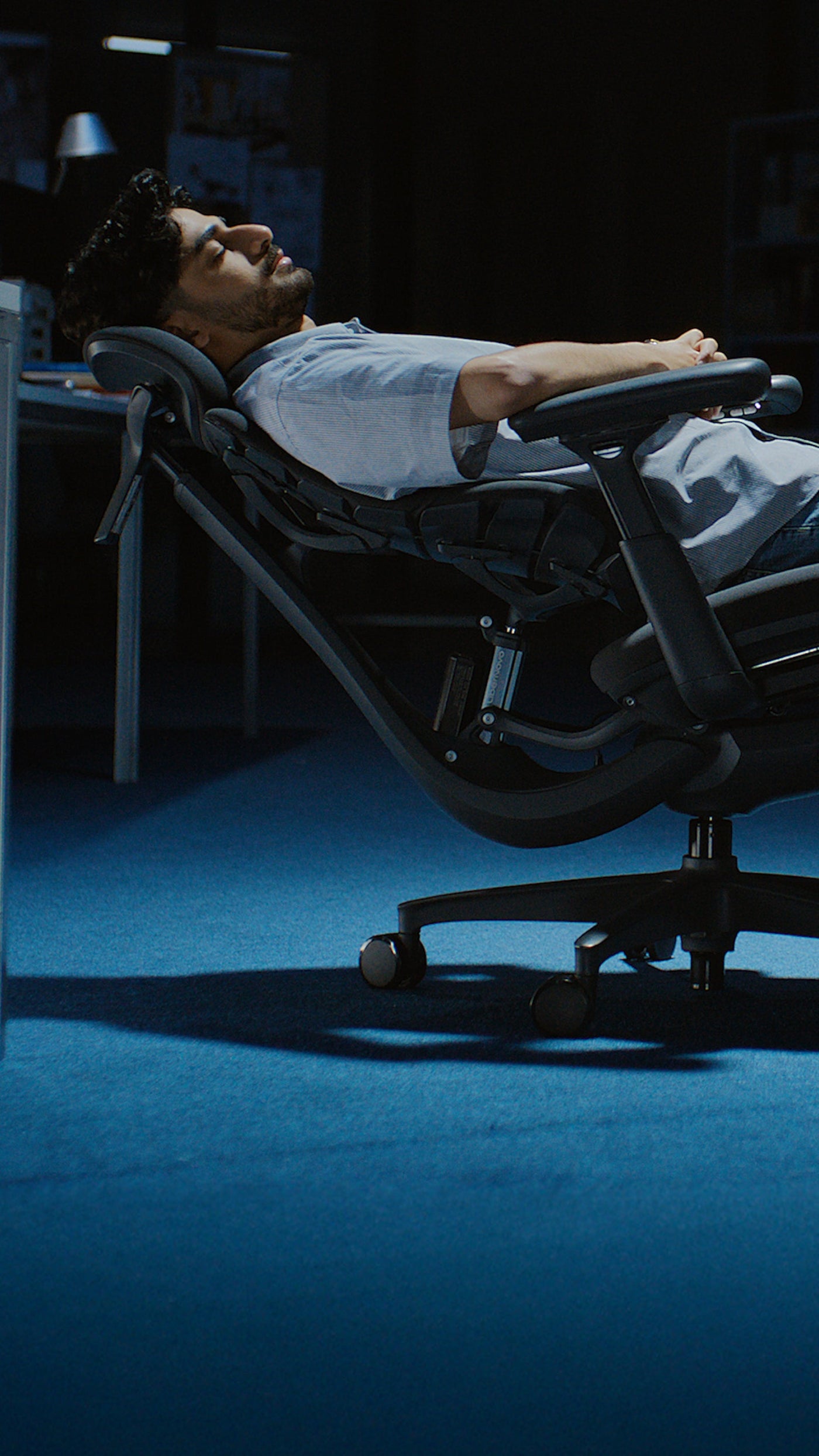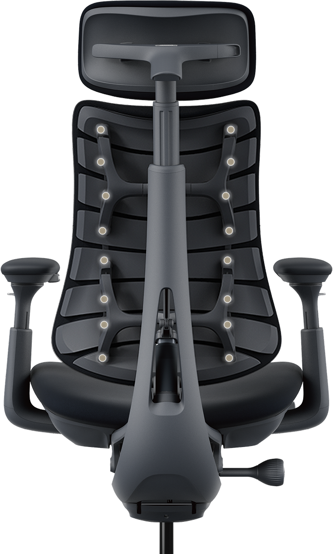 ダイナミックサポート。ヘッドレストからアームレストまで、身体の動きに追従して自動で調整。自然で快適な座り心地を実現。