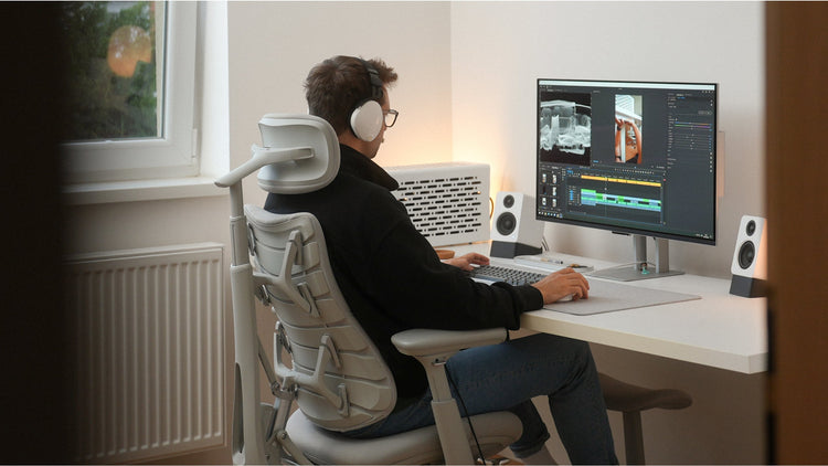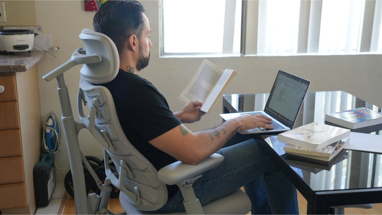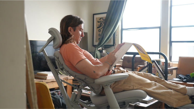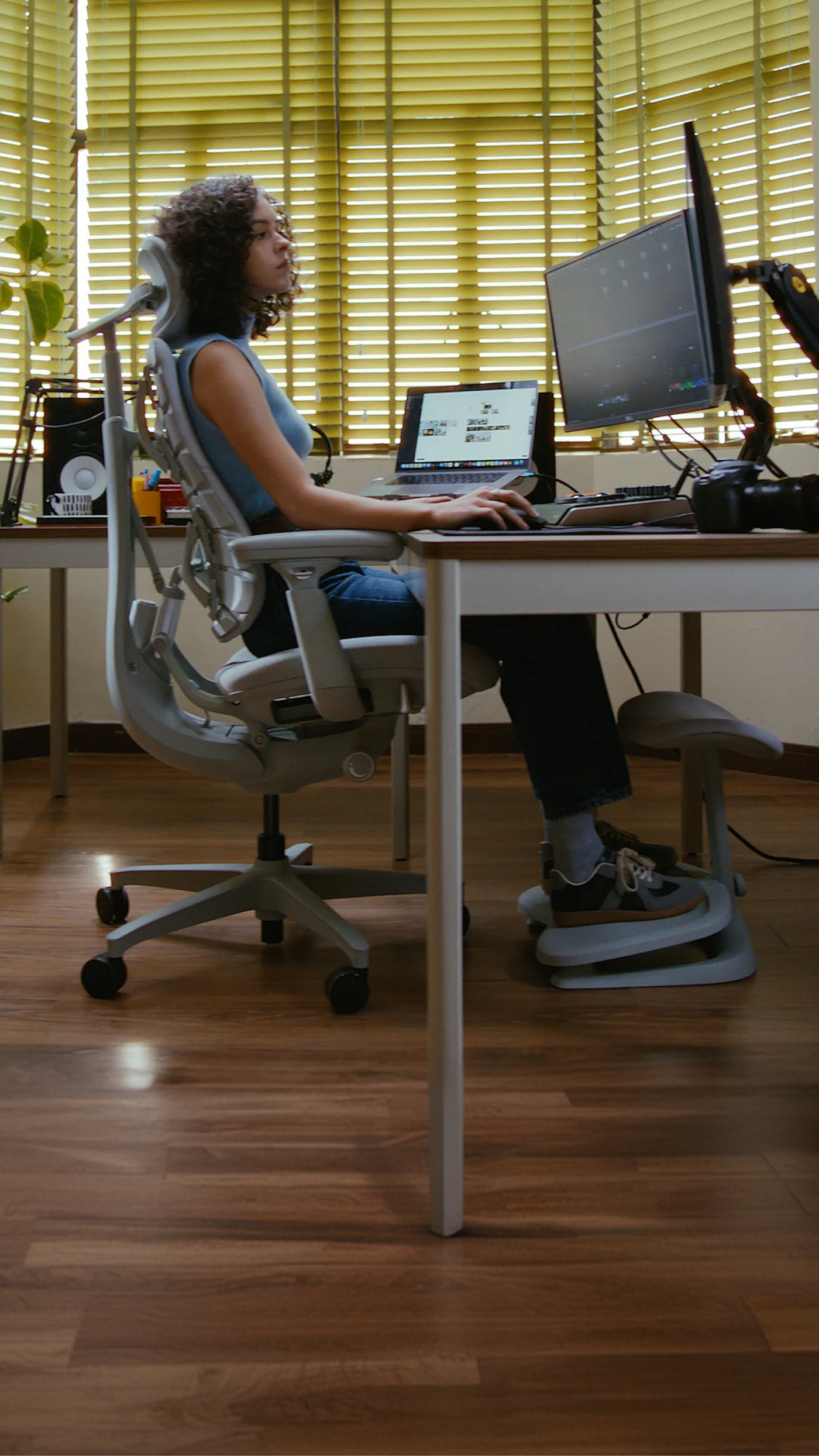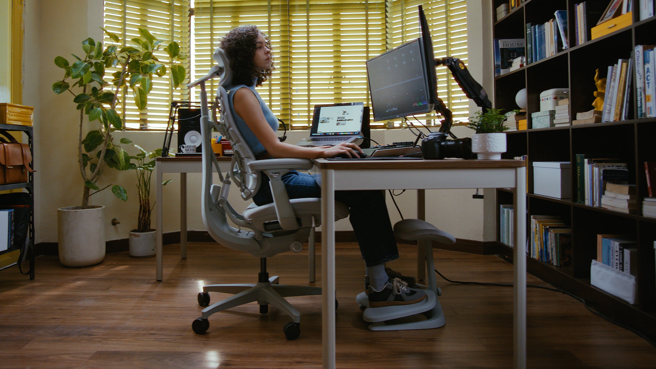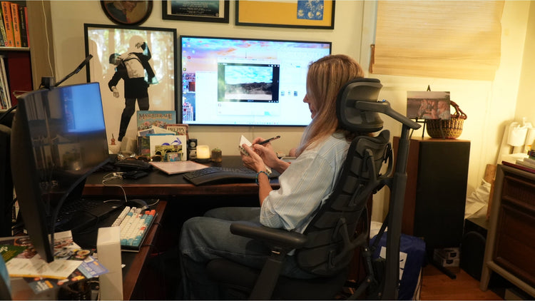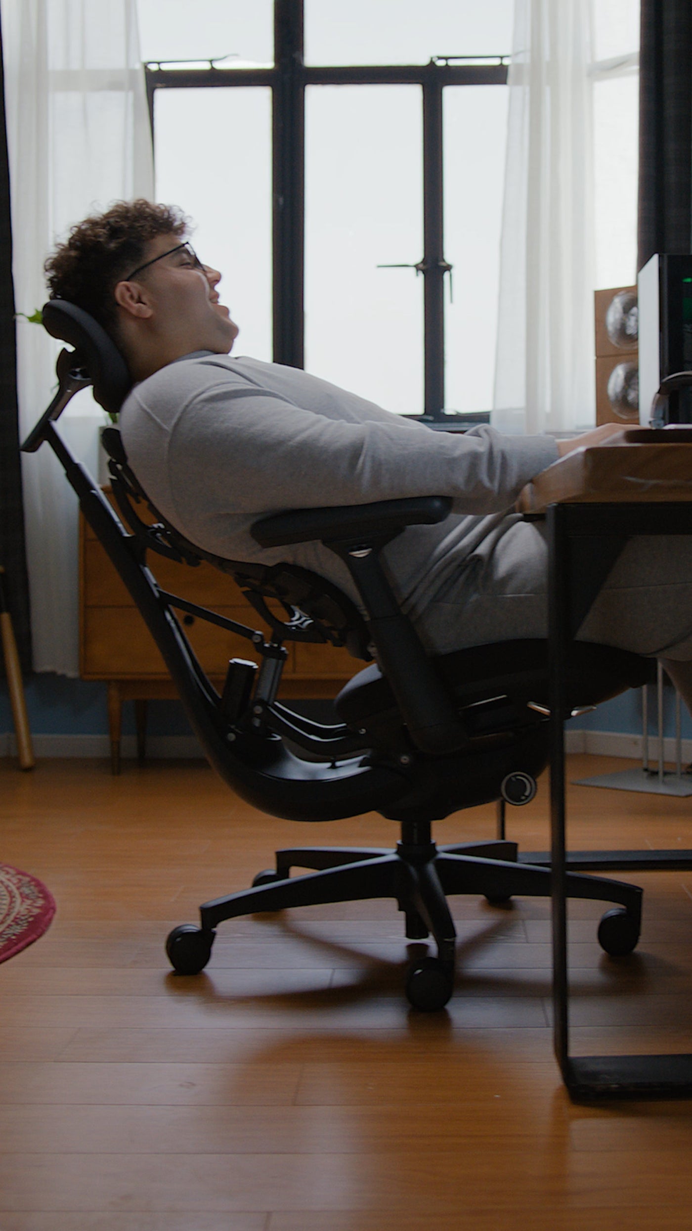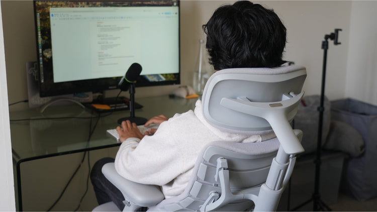 彼女は高校時代から映画制作に取り組む生涯のフィルムメーカーです。大学院では即興の特殊効果を駆使してSFショート映画を単独で制作しました。編集作業やZoom会議が続いて椅子に縛られる生活ですが、ピラティスなどの健康習慣も欠かしません。コロナ禍に購入した固定式の椅子による慢性的な痛みに悩まされていましたが、柔らかく動きに追従するLiberNovoの動的サポートによって大きな改善を実感。背骨を伸ばすストレッチ機能を気に入っていて、1日の90%で「創作のパートナー」として活用していると言います。同僚からも「立ち上がれないほど快適」と評価され、デスクワーク中心のクリエイターにおすすめしています。
