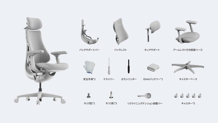 LiberNovo Omni は、付属の簡易工具だけで簡単に組み立てができます。所要時間は約 15~20 分で、Herman Miller Aeron や Steelcase Gesture とほぼ同じくらいです。分かりやすい説明書に加え、オンラインの組み立てガイドも用意していますので、ぜひご活用ください。