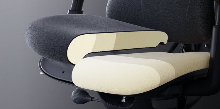 3段階の硬度を統合。硬い後部が座骨を支え、柔らかい前部が脚の圧迫を軽減します。血行を促すことで、長時間の着座も楽になります