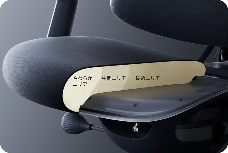 3段階の硬さを組み合わせたマルチ密度クッションを採用。硬めの後部は坐骨をしっかりサポートし、柔らかい前部は脚への負担を軽減。安定感と長時間座れる快適さを両立しています。